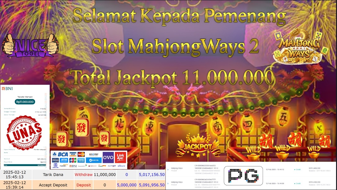 Selamat kepada member NICETOGEL User id : Yudia** Telah berhasil mendapatkan kemenangan besar pada permainan SLOT MAHJONG WAYS Dengan kemenangan Sebesar Rp.10.000.000,- Setelah mengisi formulir withdraw dengan kurung waktu hanya 5 – 10 menit pihak NICETOGEL sudah melakukan transfer kepada pemilik Userid dan dana sudah dapat di cairkan oleh pemenang. Bukti pembayaran yang kami berikan merupakan bukti pembayaran yang SAH / VALID yang langung di dapatkan melaui tanda transfer transaksi dari Bank yang di tuju.