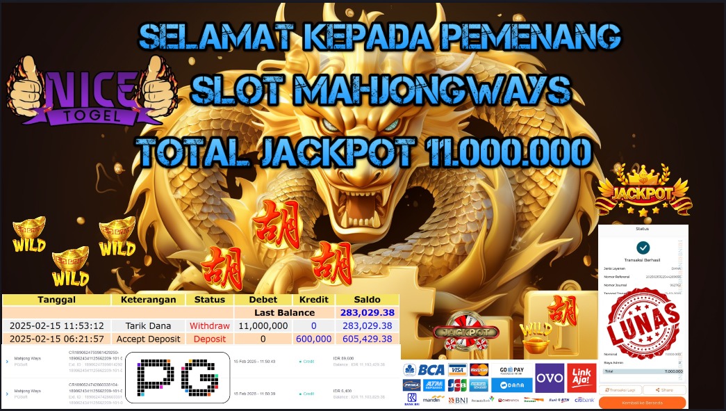 Selamat kepada member NICETOGEL User id : DESA** Telah berhasil mendapatkan kemenangan besar pada permainan SLOT MAHJONG WAYS Dengan kemenangan Sebesar Rp.11.000.000,- Setelah mengisi formulir withdraw dengan kurung waktu hanya 5 – 10 menit pihak NICETOGEL sudah melakukan transfer kepada pemilik Userid dan dana sudah dapat di cairkan oleh pemenang. Bukti pembayaran yang kami berikan merupakan bukti pembayaran yang SAH / VALID yang langung di dapatkan melaui tanda transfer transaksi dari Bank yang di tuju.