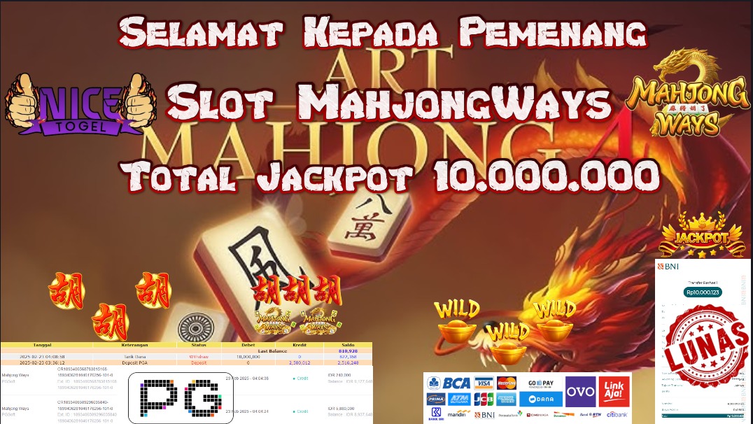 Selamat kepada member NICETOGEL User id : Afan** Telah berhasil mendapatkan kemenangan besar pada permainan SLOT MAHJONG WAYS Dengan kemenangan Sebesar Rp.10.000.000,- Setelah mengisi formulir withdraw dengan kurung waktu hanya 5 – 10 menit pihak NICETOGEL sudah melakukan transfer kepada pemilik Userid dan dana sudah dapat di cairkan oleh pemenang. Bukti pembayaran yang kami berikan merupakan bukti pembayaran yang SAH / VALID yang langung di dapatkan melaui tanda transfer transaksi dari Bank yang di tuju.