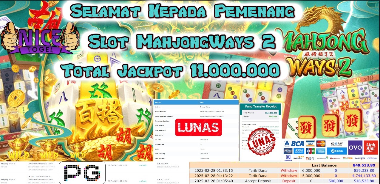 Selamat kepada member NICETOGEL User id : Joas** Telah berhasil mendapatkan kemenangan besar pada permainan SLOT MAHJONG WAYS 2 Dengan kemenangan Sebesar Rp.11.000.000,- Setelah mengisi formulir withdraw dengan kurung waktu hanya 5 – 10 menit pihak NICETOGEL sudah melakukan transfer kepada pemilik Userid dan dana sudah dapat di cairkan oleh pemenang. Bukti pembayaran yang kami berikan merupakan bukti pembayaran yang SAH / VALID yang langung di dapatkan melaui tanda transfer transaksi dari Bank yang di tuju.