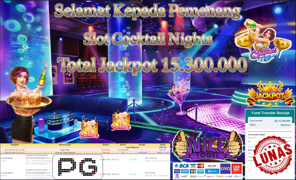 Selamat kepada member NICETOGEL User id : Papi0** Telah berhasil mendapatkan kemenangan besar pada permainan SLOT COKTAIL NIGHTS Dengan kemenangan Sebesar Rp.15.300.000,- Setelah mengisi formulir withdraw dengan kurung waktu hanya 5 – 10 menit pihak NICETOGEL sudah melakukan transfer kepada pemilik Userid dan dana sudah dapat di cairkan oleh pemenang. Bukti pembayaran yang kami berikan merupakan bukti pembayaran yang SAH / VALID yang langung di dapatkan melaui tanda transfer transaksi dari Bank yang di tuju.