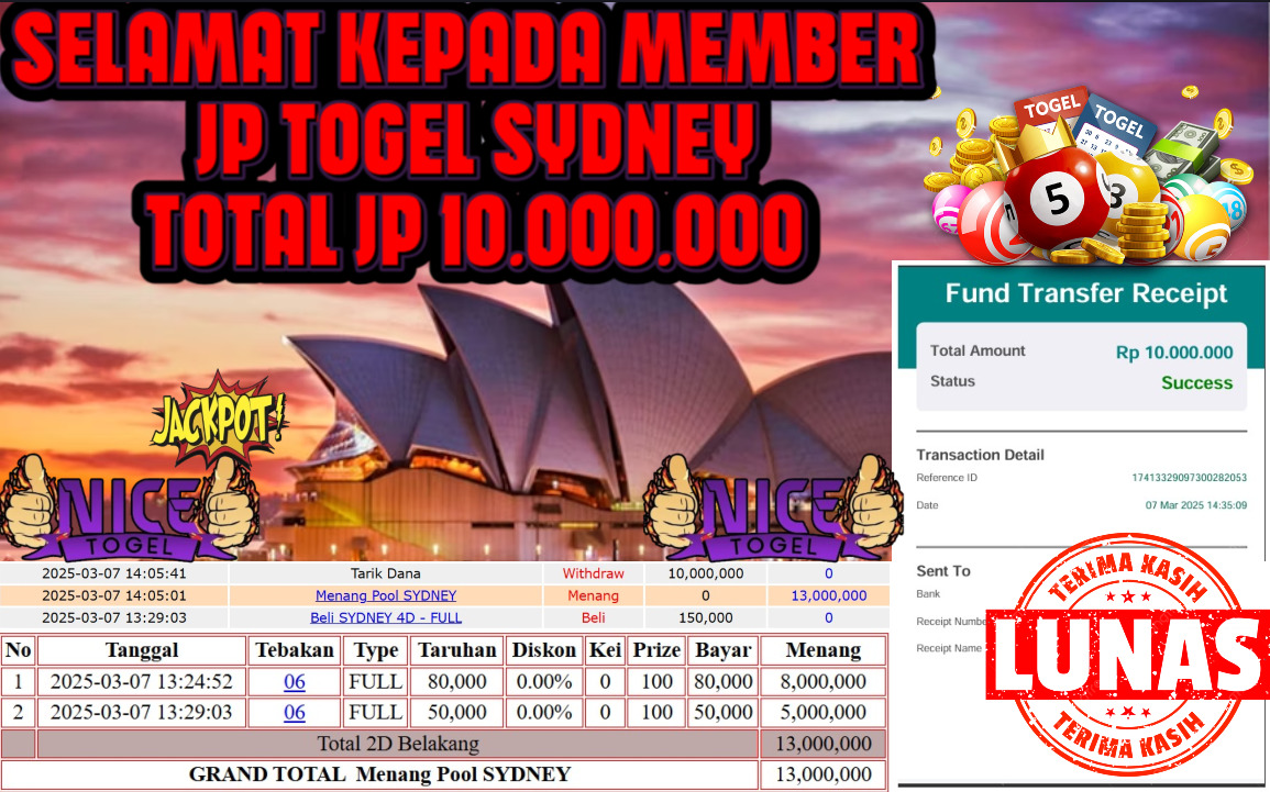 Selamat kepada member NICETOGEL User id : b4ba** Telah berhasil mendapatkan kemenangan besar pada permainan TOGEL SYDNEY Rp 10.000.000,- Setelah mengisi formulir withdraw dengan kurung waktu hanya 5 – 10 menit pihak NICETOGEL sudah melakukan transfer kepada pemilik Userid dan dana sudah dapat di cairkan oleh pemenang. Bukti pembayaran yang kami berikan merupakan bukti pembayaran yang SAH / VALID yang langung di dapatkan melaui tanda transfer transaksi dari Bank yang di tuju.