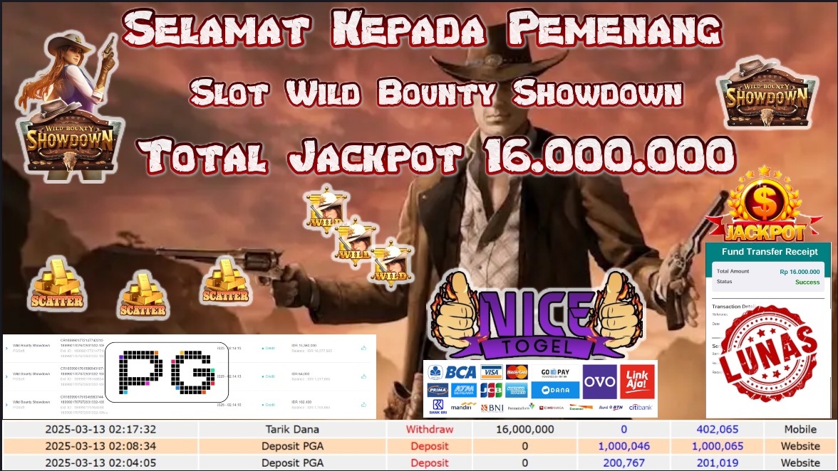 Selamat kepada member NICETOGEL User id : Hajie** Telah berhasil mendapatkan kemenangan besar pada permainan SLOT WILD BOUNTY SHOWDOWN Dengan kemenangan Sebesar Rp.16.000.000,- Setelah mengisi formulir withdraw dengan kurung waktu hanya 5 – 10 menit pihak NICETOGEL sudah melakukan transfer kepada pemilik Userid dan dana sudah dapat di cairkan oleh pemenang. Bukti pembayaran yang kami berikan merupakan bukti pembayaran yang SAH / VALID yang langung di dapatkan melaui tanda transfer transaksi dari Bank yang di tuju.
