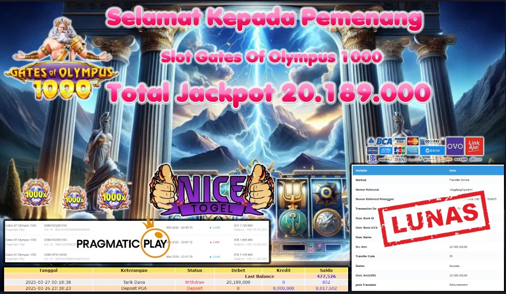 Selamat kepada member NICETOGEL User id :pao** Telah berhasil mendapatkan kemenangan besar pada permainan SLOT GATES OF OLYMPUS 1000 Dengan kemenangan Sebesar Rp.20.189.000,- Setelah mengisi formulir withdraw dengan kurung waktu hanya 5 – 10 menit pihak NICETOGEL sudah melakukan transfer kepada pemilik Userid dan dana sudah dapat di cairkan oleh pemenang. Bukti pembayaran yang kami berikan merupakan bukti pembayaran yang SAH / VALID yang langung di dapatkan melaui tanda transfer transaksi dari Bank yang di tuju.