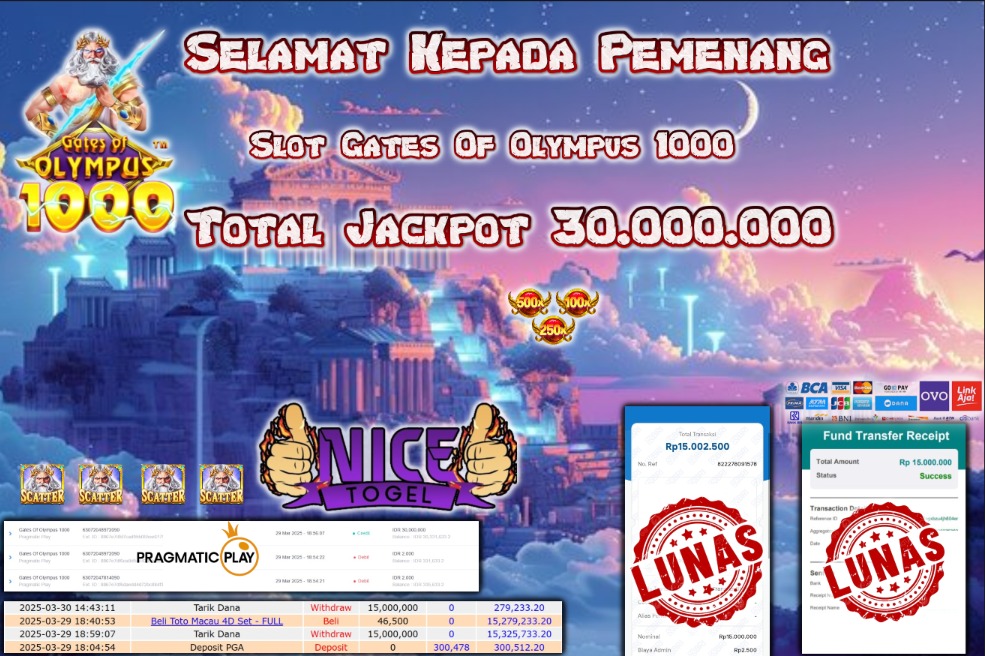 Selamat kepada member NICETOGEL User id :Hari** Telah berhasil mendapatkan kemenangan besar pada permainan SLOT GATES OF OLYMPUS 1000 Dengan kemenangan Sebesar Rp.30.000.000,- Setelah mengisi formulir withdraw dengan kurung waktu hanya 5 – 10 menit pihak NICETOGEL sudah melakukan transfer kepada pemilik Userid dan dana sudah dapat di cairkan oleh pemenang. Bukti pembayaran yang kami berikan merupakan bukti pembayaran yang SAH / VALID yang langung di dapatkan melaui tanda transfer transaksi dari Bank yang di tuju.