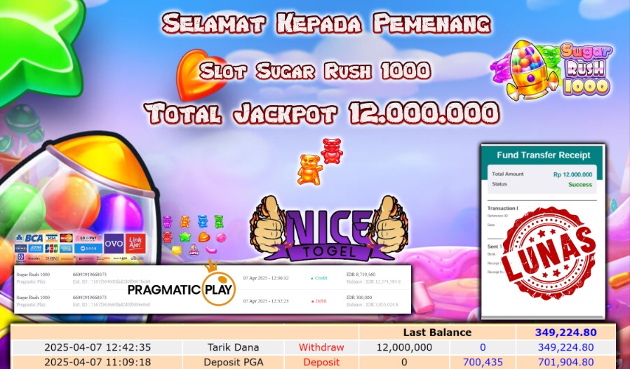 Selamat kepada member NICETOGEL User id :LUSI** Telah berhasil mendapatkan kemenangan besar pada permainan SLOT SUGAR RUSH1000 Dengan kemenangan Sebesar Rp.12.000.000,- Setelah mengisi formulir withdraw dengan kurung waktu hanya 5 – 10 menit pihak NICETOGEL sudah melakukan transfer kepada pemilik Userid dan dana sudah dapat di cairkan oleh pemenang. Bukti pembayaran yang kami berikan merupakan bukti pembayaran yang SAH / VALID yang langung di dapatkan melaui tanda transfer transaksi dari Bank yang di tuju.