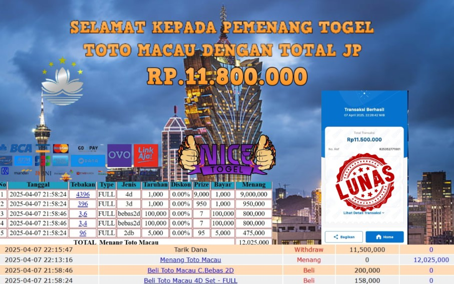 Selamat kepada member NICETOGEL User id :duni** Telah berhasil mendapatkan kemenangan besar pada permainan TOGEL TOTO MACAU Dengan kemenangan Sebesar Rp.11.800.000,- Setelah mengisi formulir withdraw dengan kurung waktu hanya 5 – 10 menit pihak NICETOGEL sudah melakukan transfer kepada pemilik Userid dan dana sudah dapat di cairkan oleh pemenang. Bukti pembayaran yang kami berikan merupakan bukti pembayaran yang SAH / VALID yang langung di dapatkan melaui tanda transfer transaksi dari Bank yang di tuju.