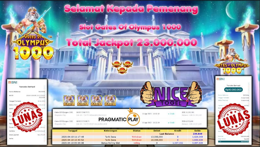 Selamat kepada member NICETOGEL User id :LUSIA** Telah berhasil mendapatkan kemenangan besar pada permainan SLOT GATES OF OLYMPUS 1000 Dengan kemenangan Sebesar Rp.23.000.000,- Setelah mengisi formulir withdraw dengan kurung waktu hanya 5 – 10 menit pihak NICETOGEL sudah melakukan transfer kepada pemilik Userid dan dana sudah dapat di cairkan oleh pemenang. Bukti pembayaran yang kami berikan merupakan bukti pembayaran yang SAH / VALID yang langung di dapatkan melaui tanda transfer transaksi dari Bank yang di tuju.