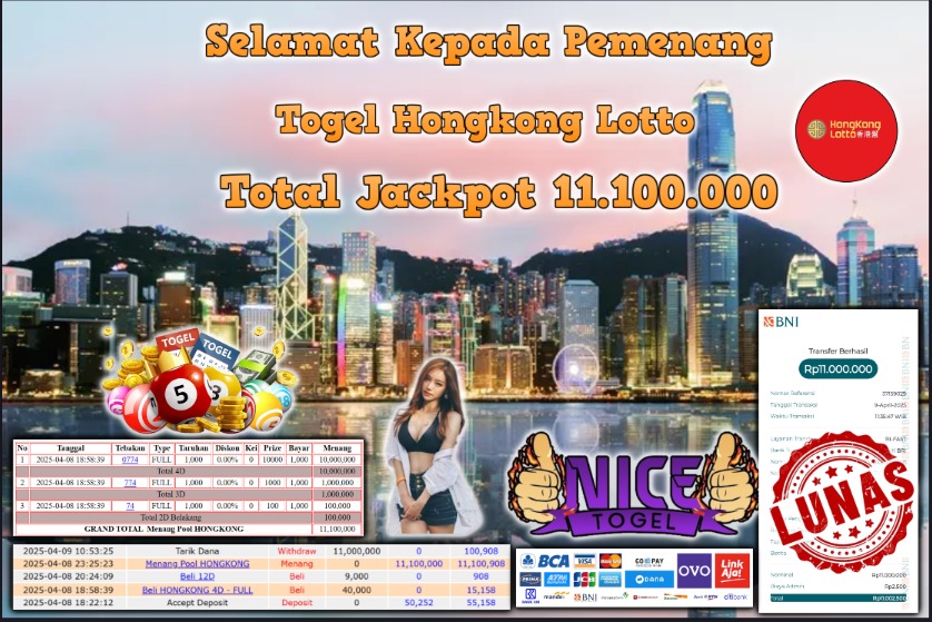 Selamat kepada member NICETOGEL User id :PADL** Telah berhasil mendapatkan kemenangan besar pada permainan TOGEL HONGKONG LOTTO Dengan kemenangan Sebesar Rp.11.100.000,- Setelah mengisi formulir withdraw dengan kurung waktu hanya 5 – 10 menit pihak NICETOGEL sudah melakukan transfer kepada pemilik Userid dan dana sudah dapat di cairkan oleh pemenang. Bukti pembayaran yang kami berikan merupakan bukti pembayaran yang SAH / VALID yang langung di dapatkan melaui tanda transfer transaksi dari Bank yang di tuju.