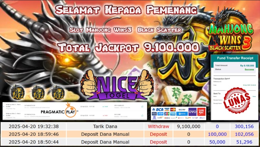 Selamat kepada member NICETOGEL User id :BETTA** Telah berhasil mendapatkan kemenangan besar pada permainan SLOT MAHJONG WINS 3 Dengan kemenangan Sebesar Rp.9.100.000,- Setelah mengisi formulir withdraw dengan kurung waktu hanya 5 – 10 menit pihak NICETOGEL sudah melakukan transfer kepada pemilik Userid dan dana sudah dapat di cairkan oleh pemenang. Bukti pembayaran yang kami berikan merupakan bukti pembayaran yang SAH / VALID yang langung di dapatkan melaui tanda transfer transaksi dari Bank yang di tuju.