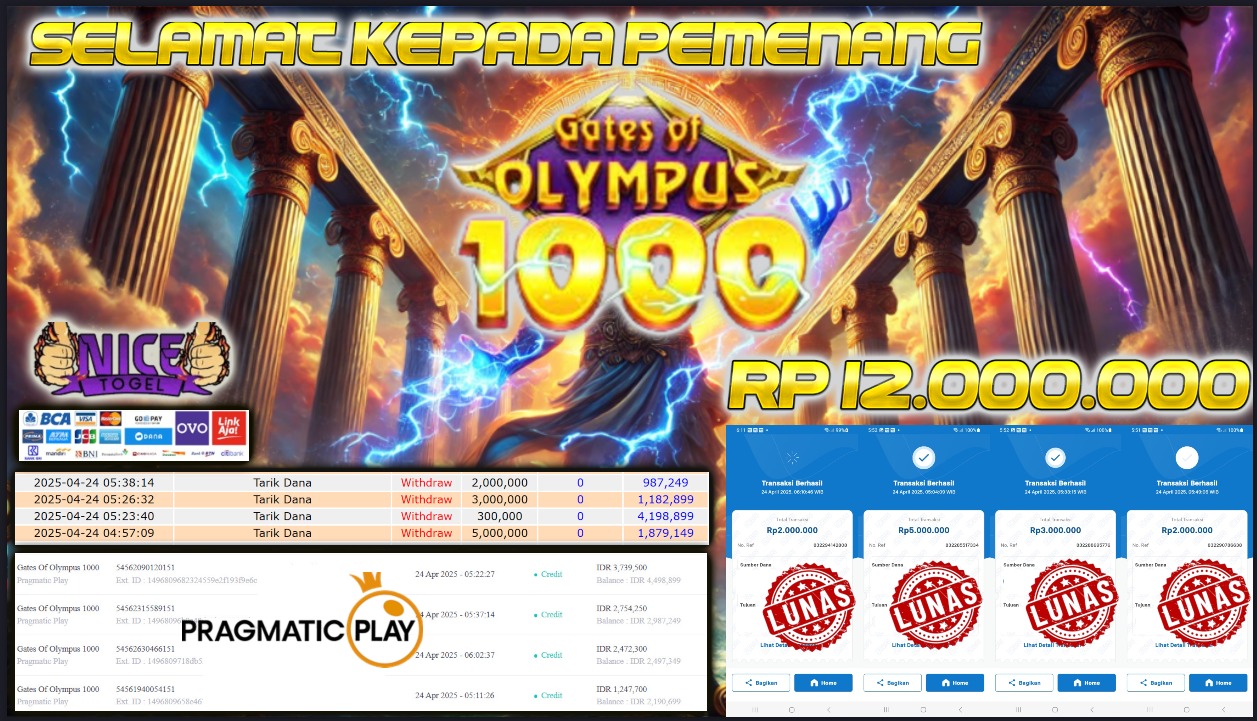 Selamat kepada member NICETOGEL User id :BUD** Telah berhasil mendapatkan kemenangan besar pada permainan SLOT GATES OLYMPUS 1000 Dengan kemenangan Sebesar Rp.12.000.000,- Setelah mengisi formulir withdraw dengan kurung waktu hanya 5 – 10 menit pihak NICETOGEL sudah melakukan transfer kepada pemilik Userid dan dana sudah dapat di cairkan oleh pemenang. Bukti pembayaran yang kami berikan merupakan bukti pembayaran yang SAH / VALID yang langung di dapatkan melaui tanda transfer transaksi dari Bank yang di tuju.