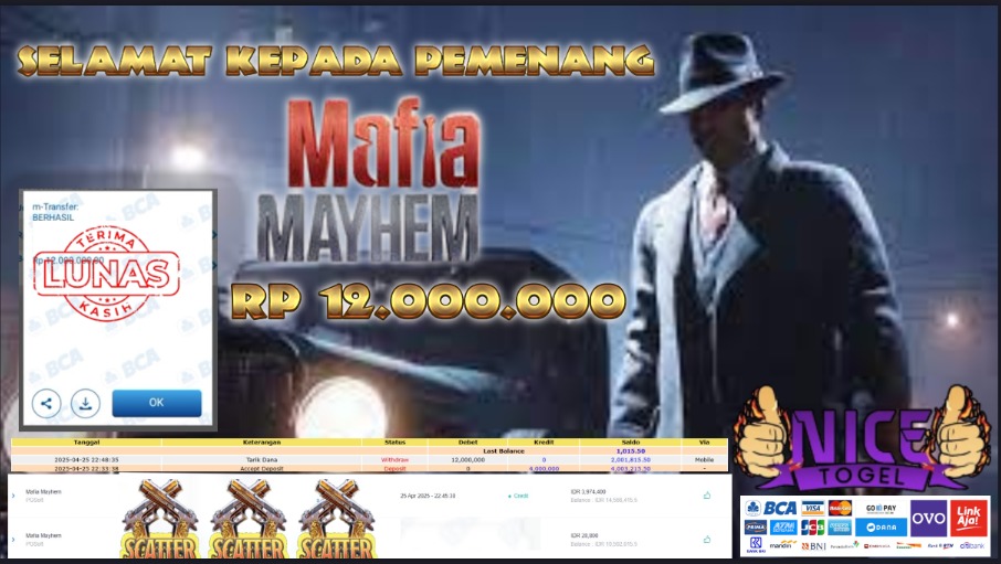 Selamat kepada member NICETOGEL User id :TRIOE** Telah berhasil mendapatkan kemenangan besar pada permainan SLOT MAHFIA MAYHEM Dengan kemenangan Sebesar Rp.12.000.000,- Setelah mengisi formulir withdraw dengan kurung waktu hanya 5 – 10 menit pihak NICETOGEL sudah melakukan transfer kepada pemilik Userid dan dana sudah dapat di cairkan oleh pemenang. Bukti pembayaran yang kami berikan merupakan bukti pembayaran yang SAH / VALID yang langung di dapatkan melaui tanda transfer transaksi dari Bank yang di tuju.