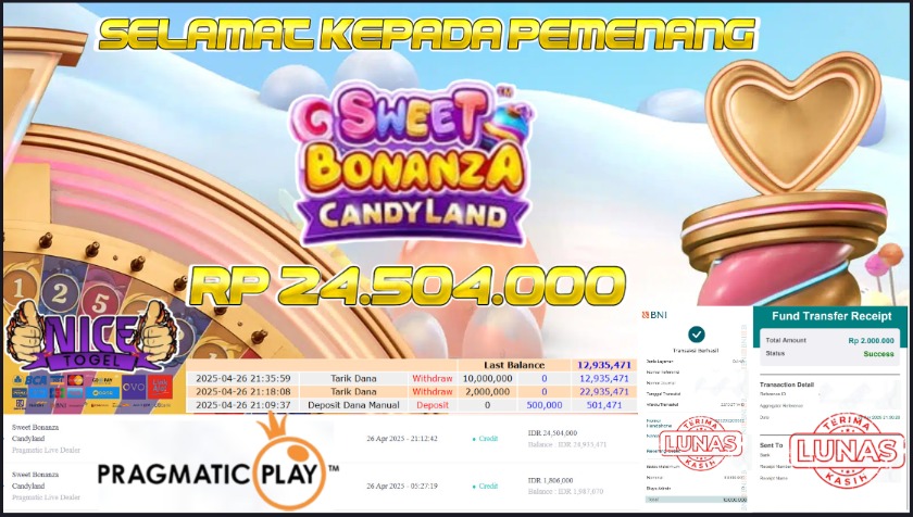 Selamat kepada member NICETOGEL User id :RAH** Telah berhasil mendapatkan kemenangan besar pada permainan LIVE GAMES SWEET BONANZA CANDYLAND Dengan kemenangan Sebesar Rp.24.504.000,- Setelah mengisi formulir withdraw dengan kurung waktu hanya 5 – 10 menit pihak NICETOGEL sudah melakukan transfer kepada pemilik Userid dan dana sudah dapat di cairkan oleh pemenang. Bukti pembayaran yang kami berikan merupakan bukti pembayaran yang SAH / VALID yang langung di dapatkan melaui tanda transfer transaksi dari Bank yang di tuju.