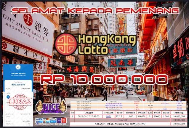 Selamat kepada member NICETOGEL User id :LUK** Telah berhasil mendapatkan kemenangan besar pada permainan TOGEL HONGKONG LOTTO Dengan kemenangan Sebesar Rp.10.000.000,- Setelah mengisi formulir withdraw dengan kurung waktu hanya 5 – 10 menit pihak NICETOGEL sudah melakukan transfer kepada pemilik Userid dan dana sudah dapat di cairkan oleh pemenang. Bukti pembayaran yang kami berikan merupakan bukti pembayaran yang SAH / VALID yang langung di dapatkan melaui tanda transfer transaksi dari Bank yang di tuju.