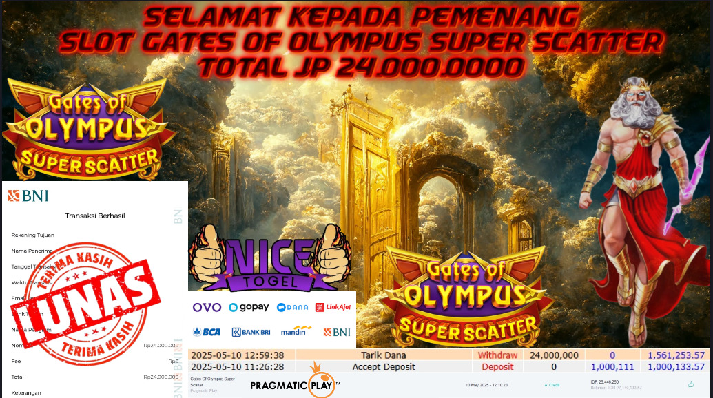 Selamat kepada member NICETOGEL User id :MYJ** Telah berhasil mendapatkan kemenangan besar pada permainan SLOT GATES OF OLYMPUS SUPER SCATTER Rp Dengan kemenangan Sebesar Rp 24.000.000,- Setelah mengisi formulir withdraw dengan kurung waktu hanya 5 – 10 menit pihak NICETOGEL sudah melakukan transfer kepada pemilik Userid dan dana sudah dapat di cairkan oleh pemenang. Bukti pembayaran yang kami berikan merupakan bukti pembayaran yang SAH / VALID yang langung di dapatkan melaui tanda transfer transaksi dari Bank yang di tuju.