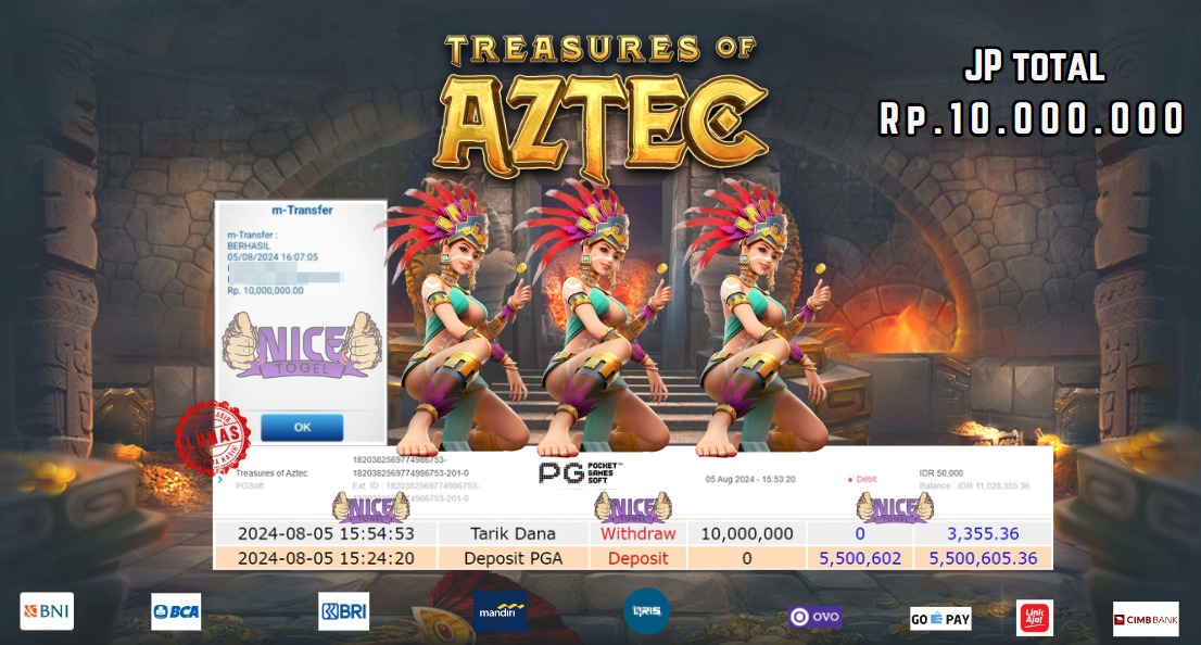 Selamat kepada User id : ERt** Telah berhasil mendapatkan kemenangan besar pada permainan TREASURES OF AZTEC Dengan kemenangan Sebesar Rp.10.000.000,- Setelah mengisi formulir withdraw dengan kurung waktu hanya 5 – 10 menit pihak NICETOGEL sudah melakukan transfer kepada pemilik Userid dan dana sudah dapat di cairkan oleh pemenang. Bukti pembayaran yang kami berikan merupakan bukti pembayaran yang SAH / VALID yang langung di dapatkan melaui tanda transfer transaksi dari Bank yang di tuju.